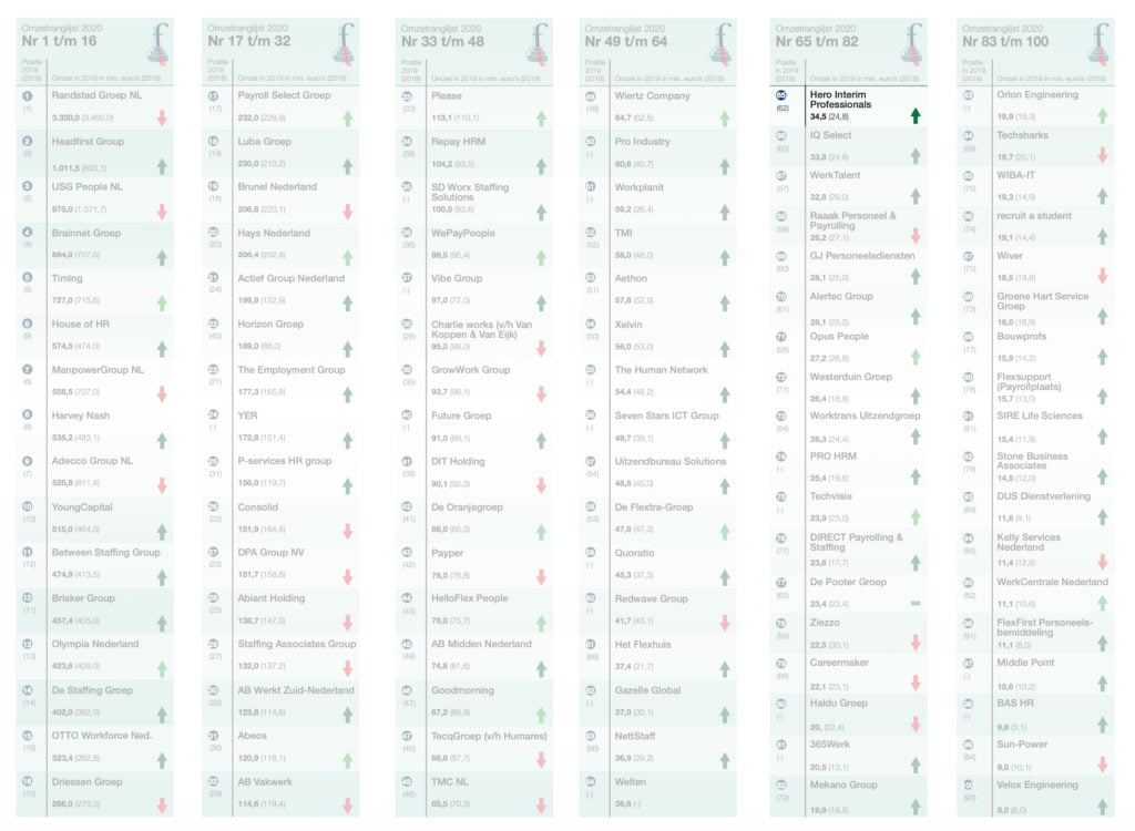 Jaarlijks publiceert Flexmarkt de Omzetranglijst; een overzicht van de 100 grootste flexbedrijven van Nederland, op basis van hun omzet. Hero is, als gevolg van een fraaie omzetstijging in 2019, te vinden op #65.